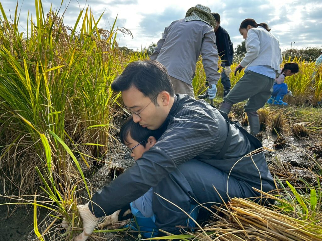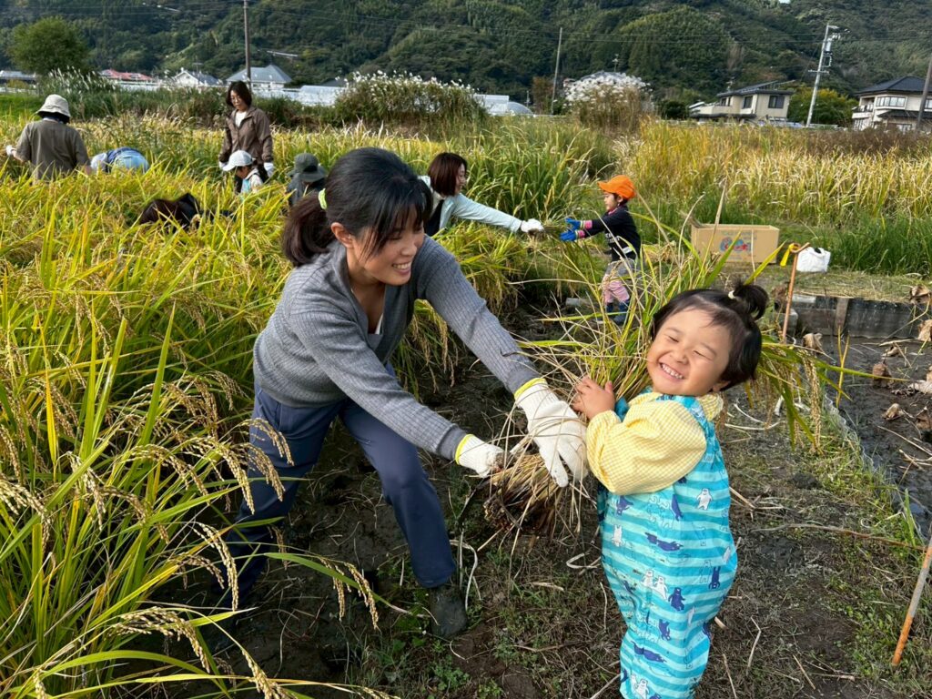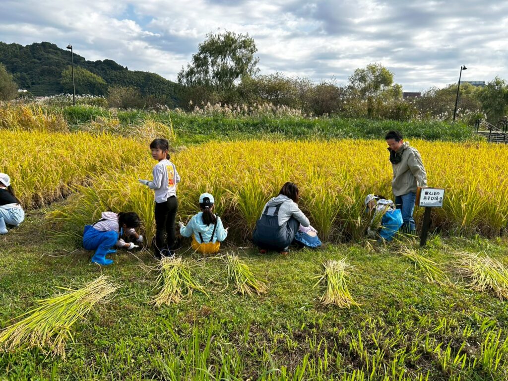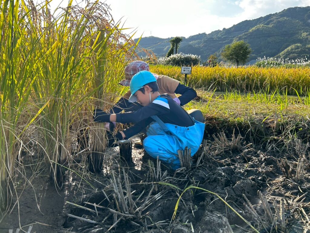 あさはた緑地の田んぼは水が多く、水を抜いていても足がとられるほどぬかるんでいて、稲刈りも一苦労💦「足がはまった!」「助けて!引っ張って!」とワーワー言いながら稲刈りをしました。