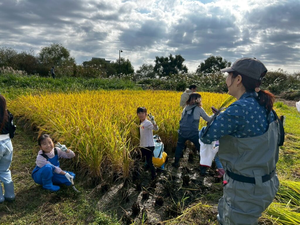 まずは、稲刈りです。暑く長い夏を乗り越え、カメムシの攻撃にも耐えた稲は黄金色に輝いていました🌾✨久しぶりに集まった米部部員も、垂れ下がる稲穂に感動していたようです。中には、「今までいたオタマジャクシ、水なくなっちゃったけど大丈夫なの?」と生き物の心配をしている子もいました。