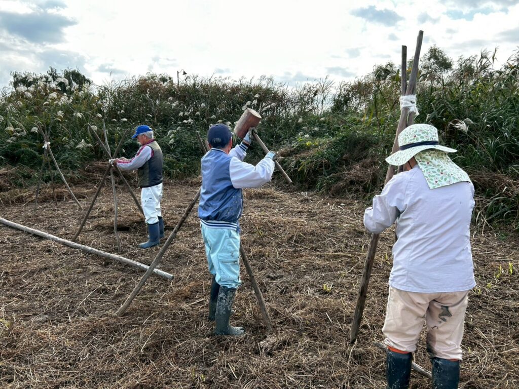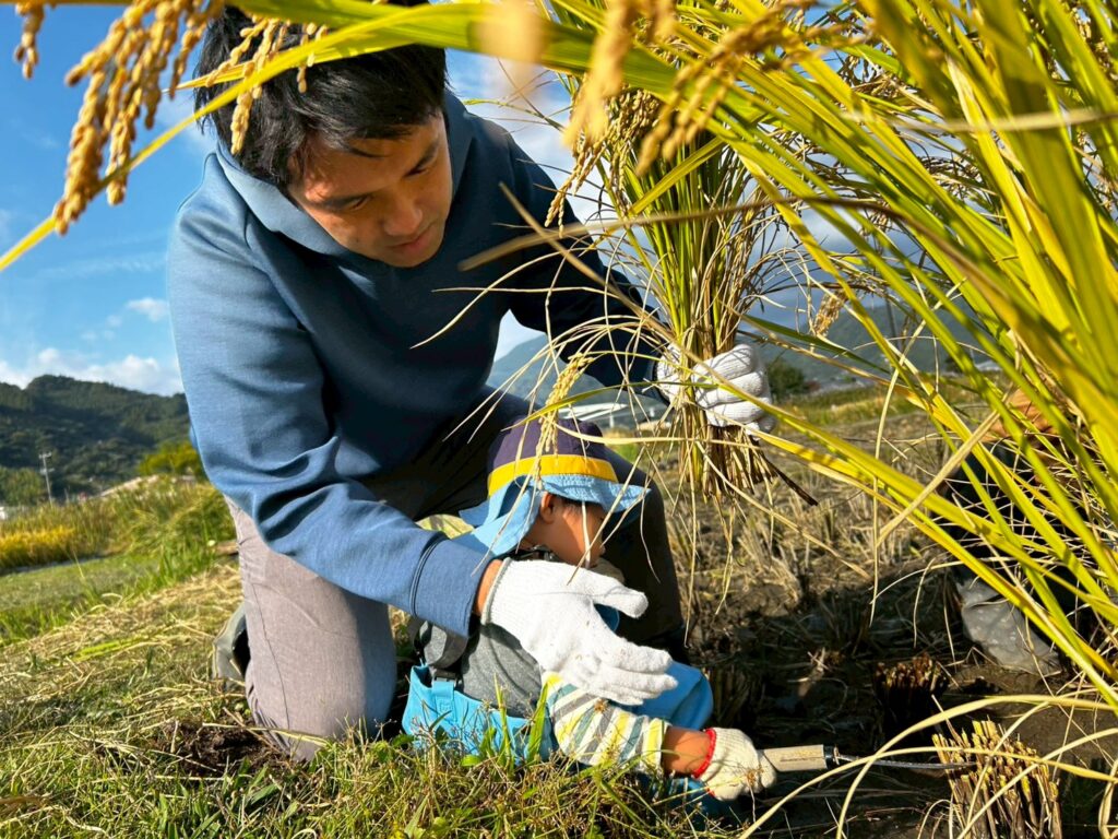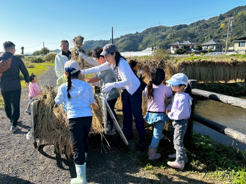 今年は、昨年の稲わらをたたいて柔らかくし、稲を束ねるのに使いました。束ねる作業は大人でも苦戦する作業だったので、子どもたちにはやはり難しく、稲を束ねる大人と、束ねた稲を運ぶ子どもという風に自然と役割分担がされていました。みんなで協力して稲刈りを終えたときは、とっても達成感にあふれていて皆さん素敵な笑顔でした。