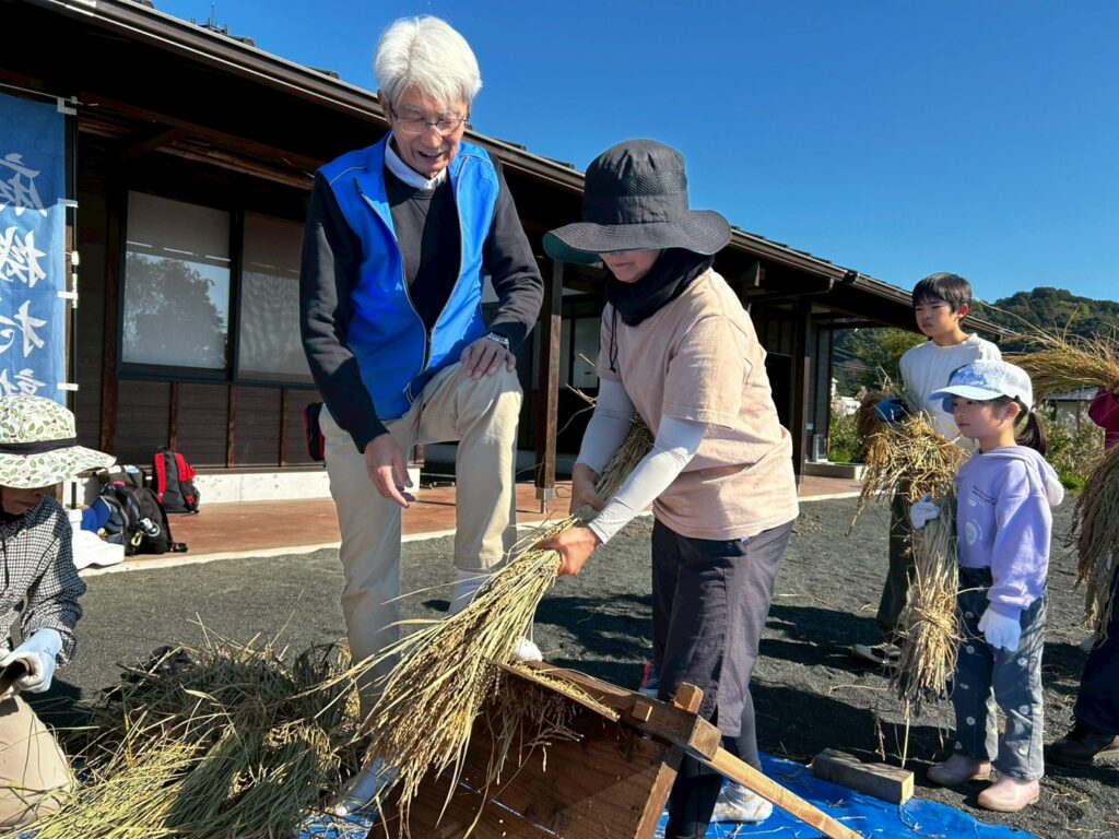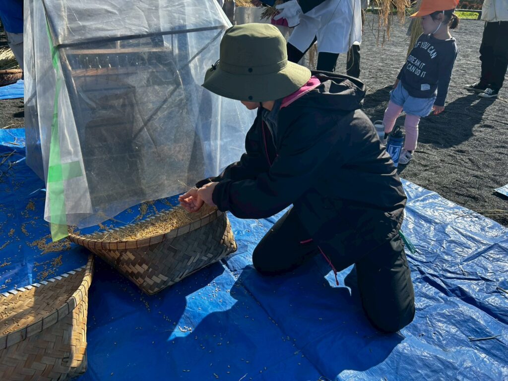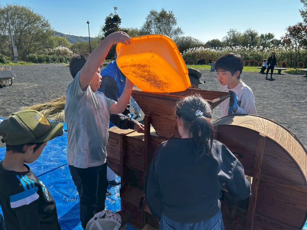 米部で2025年11月8日(土)に稲刈り、11月16日(日)に古農具を使った脱穀体験を行いました。