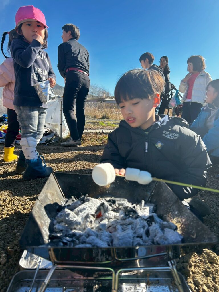 さあ、焼きあがるまでの時間。隣で炭を起こし、焼きマシュマロをしました♪