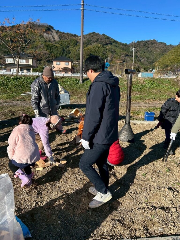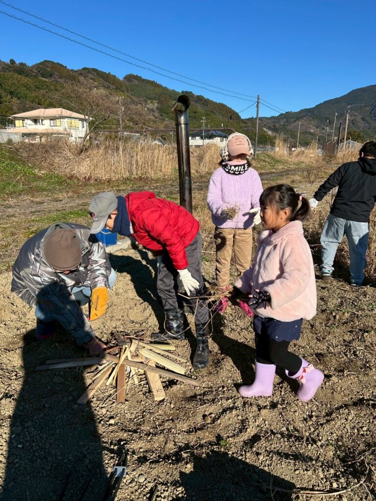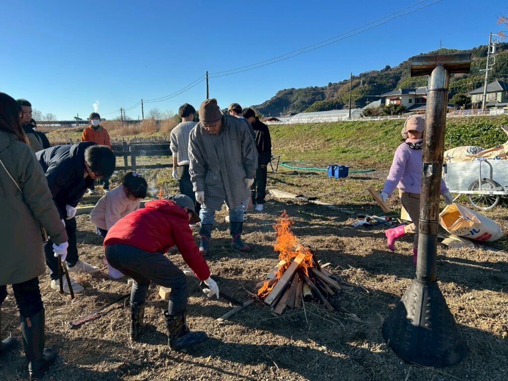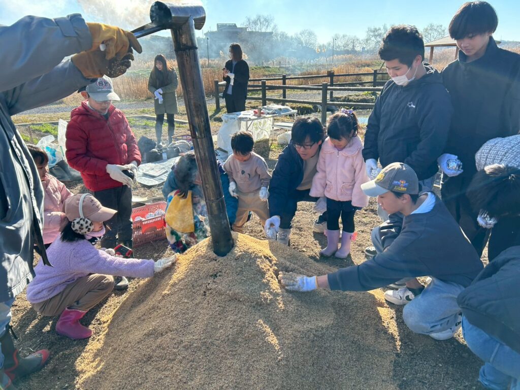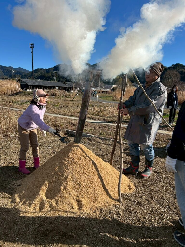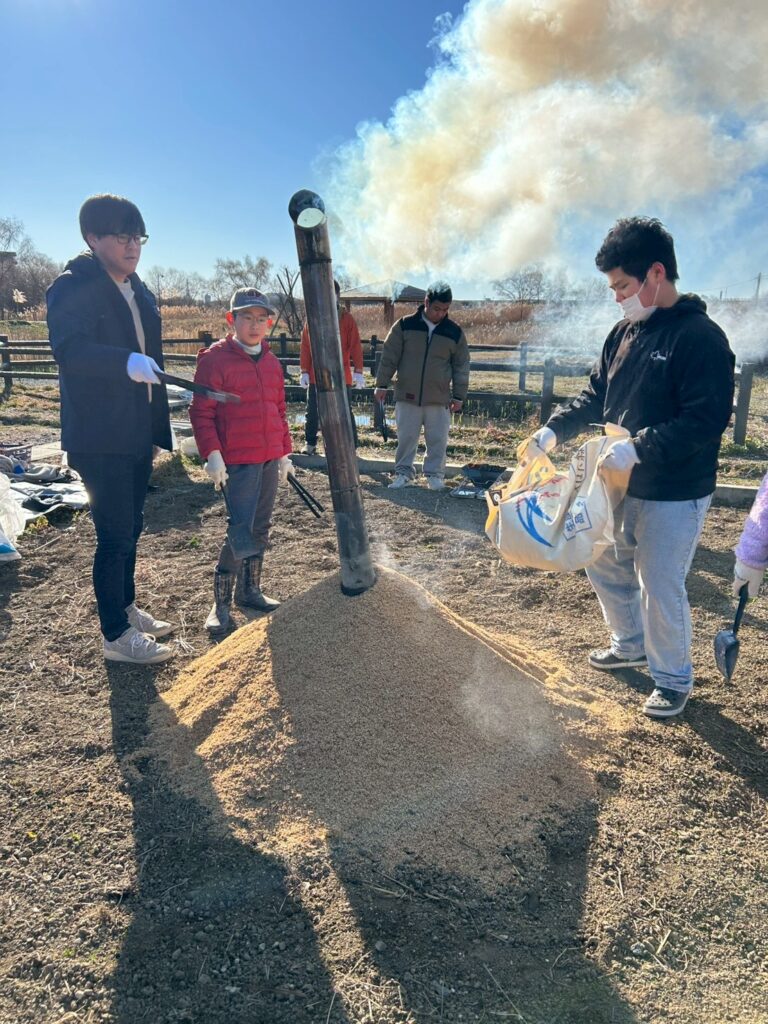 畑では、籾殻燻炭機の中に入れるたき火を作ります。手際よく火をつけてどんどん大きく育てました。