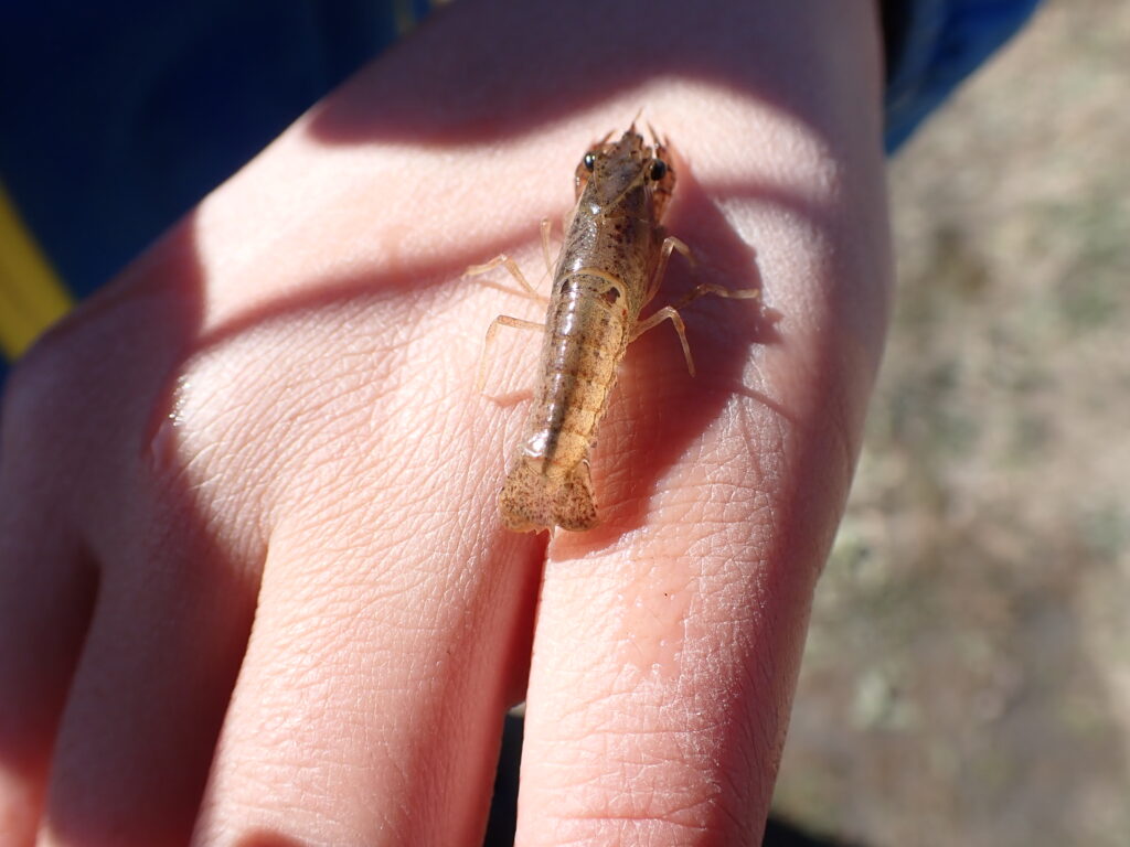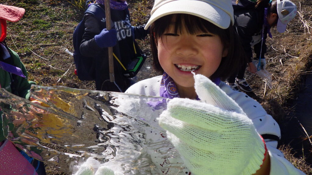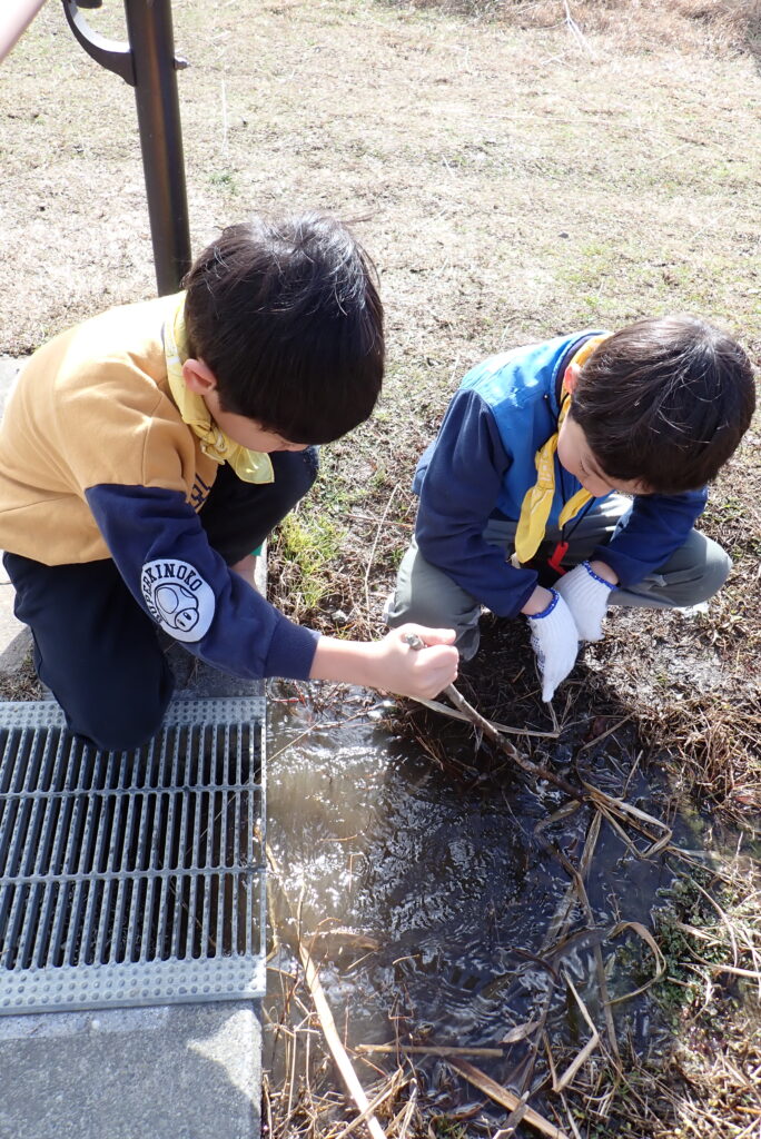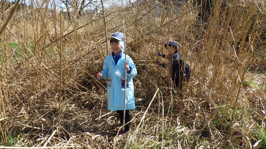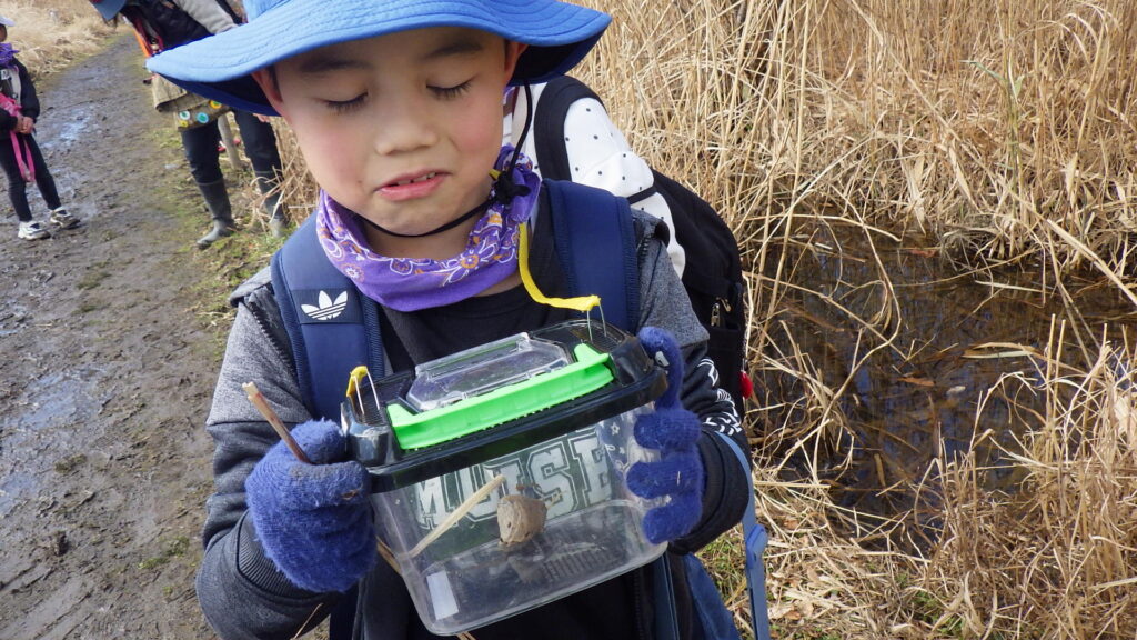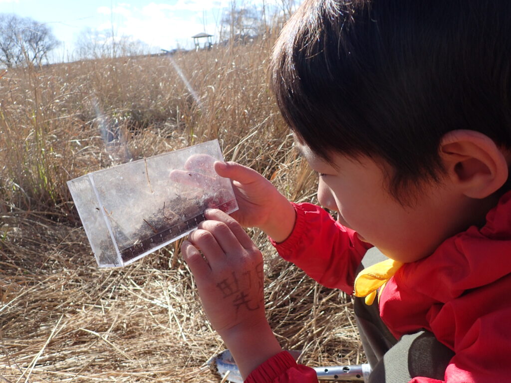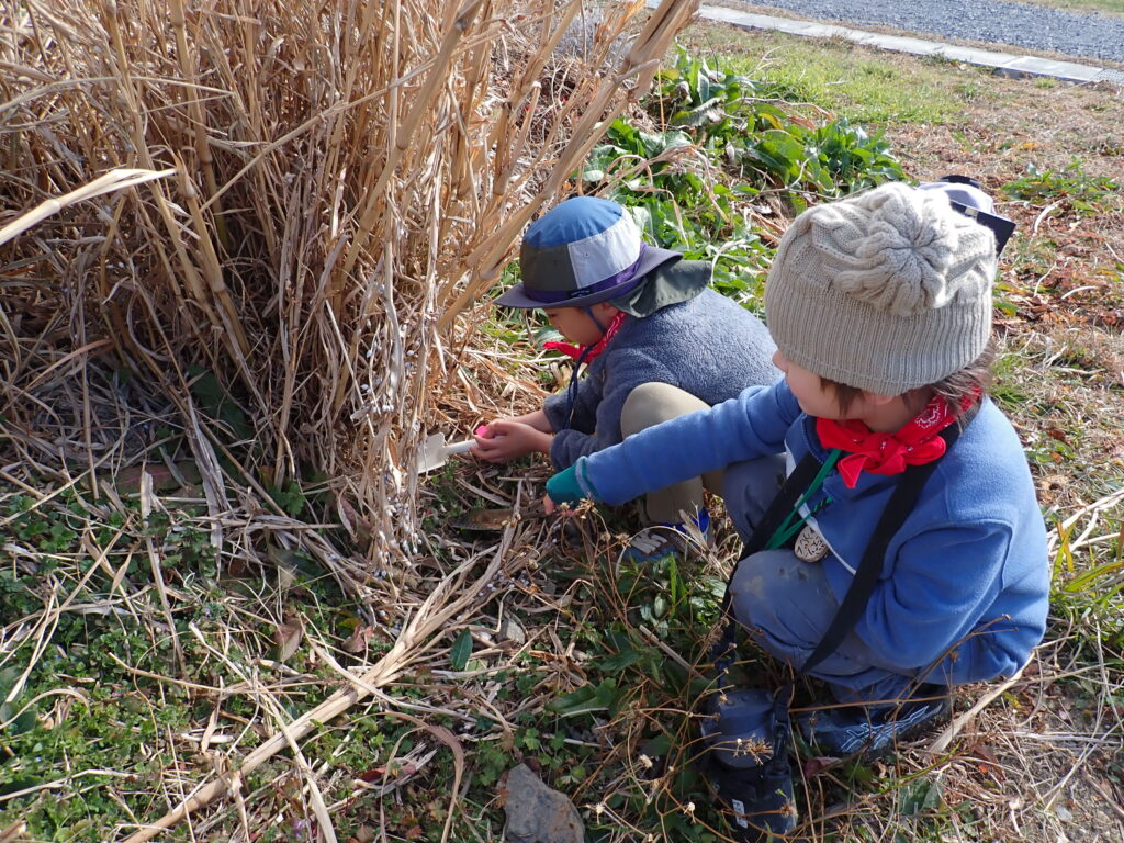 暖かいときには、すぐ見えるところにいた虫や水辺の生き物も寒くなった今はすぐには見つかりません。ショベルを使って掘ってみたり、泥がたまったようなところをたも網でガサガサしてみたり、茶色くなった草原とまだ緑色の草むらを比べてみたり…「今はこうなんじゃないか?」という予想を立ててその予想を自分で確かめました。