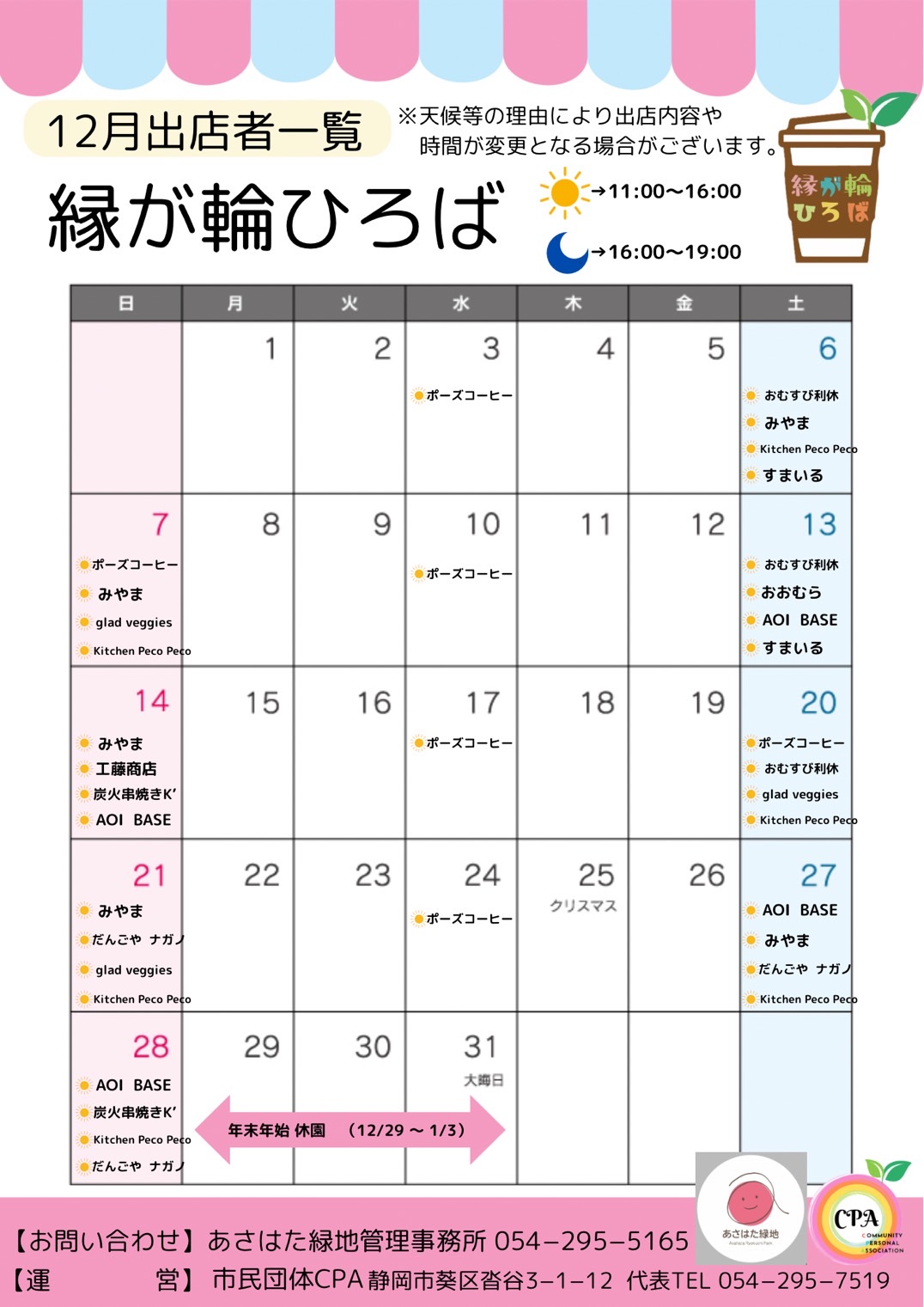 「縁が輪ひろば」は、あさはた緑地管理事務所が設置するスペースで、「CPA」に加盟する個人事業主の皆さんが出店している場所です。CPAは静岡中心で活動をしている個人事業主の市民団体です。「個人事業主同士のつながりと協力」を目的とした活動をしています。一人ではできないことも、人とひとが繋がることで大きな力となり成し遂げることができます。静岡県でがんばっている個人事業主様が繁栄すれば、地域活性化に繋がりより良い「県」になるのではないかと考えています。CPAは地域のために何ができるのかを考え、これからも活動を行って参ります。