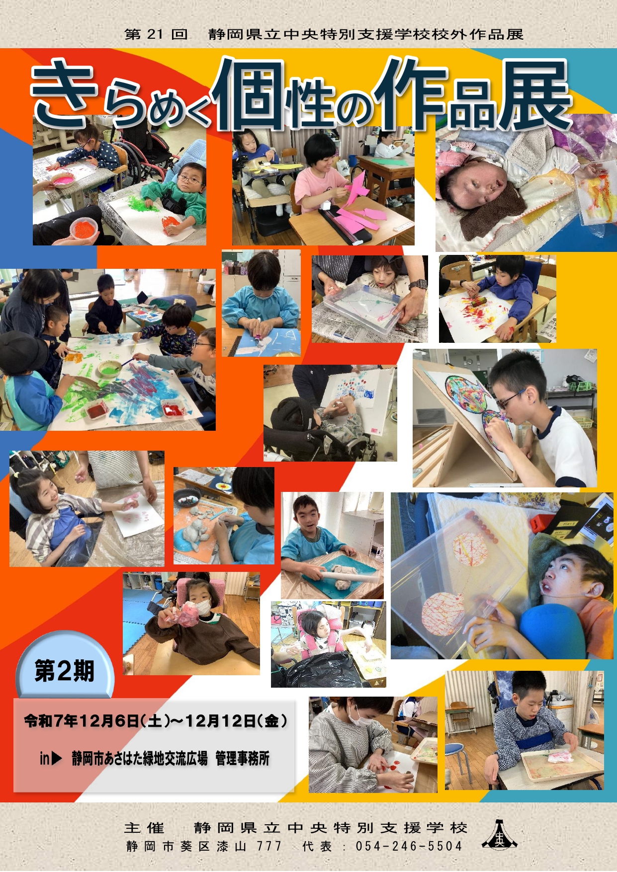あさはた緑地センターハウス会議室2にて、「きらめく個性の作品展」が開催されます。公園のすぐ向かいにある静岡県立中央特別支援学校の生徒たちが制作した、個性あふれる作品が多数展示されます。どなたでも観覧無料です。芸術の秋!ぜひこの機会に、素敵な作品を愉しまれてはいかがですか?