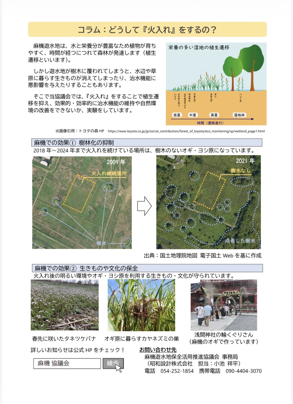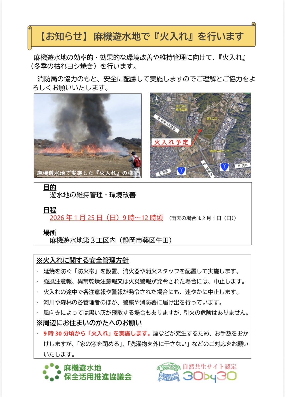 麻機遊水地の効率的、効果的な環境改善や維持管理に向けて、「火入れ(冬季の枯れヨシ焼き)」を行います。消防局の協力にもと、安全に配慮して実施しますのでご理解とご協力をよろしくお願いいたします。お問合せは、麻機遊水地保全活用推進協議会事務局 昭和設計株式会社(担当:小池)まで。