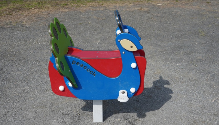 取っ手がついたカラフルなロッキング遊具。クジャクは前向きでまたがる姿勢、キリンは横向きで背もたれがついたものです。